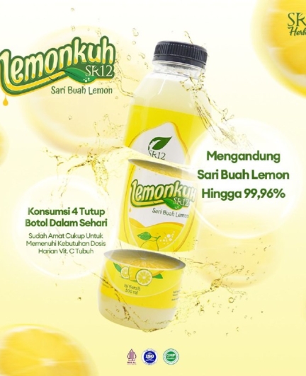 Lemonkuh SR12 adalah sari buah lemon asli yang sangat pekat. Empat takar tutup produk ini setara dengan 400 ml air lemon biasa karena mengandung 99,96% sari buah lemon asli. Ini menjadikan Lemonkuh sebagai solusi praktis dan efisien untuk mendapatkan manfaat lemon setiap hari.